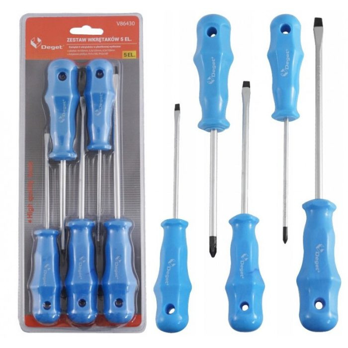 Csavarhúzó készlet króm-vanádium acélból (CrV). Az ergonomikus fogantyú szilárd fogást biztosít a szerszámon, és garantálja a hatékony és precíz munkát. A készlet három lapos csavarhúzót és két Phillips csavarhúzót tartalmaz. A csavarhúzók méreteit úgy választottuk ki, hogy illeszkedjenek a minden otthonban és műhelyben használt csavarokhoz.