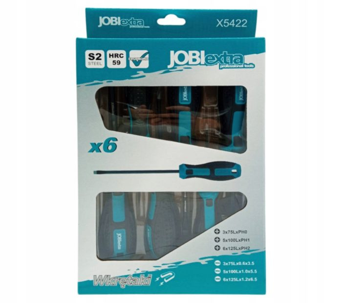 Professzionális, 6 darabos JOBI csavarhúzó készlet, a legmagasabb minőségű S2 acélból készült, 59 HRC keménységgel. Ez garantálja a tartósságot, a kopásállóságot és a megbízható működést még intenzív használat esetén is.