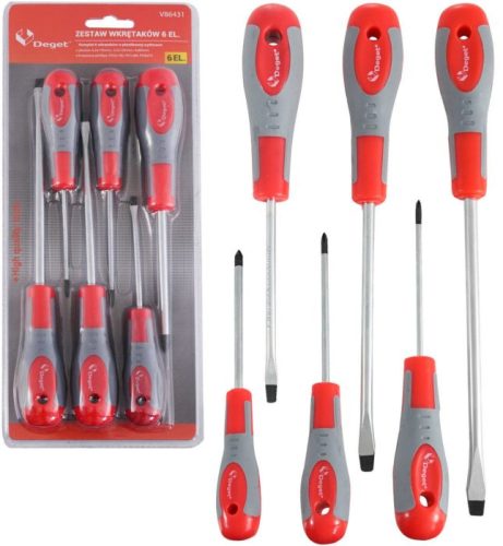 Csavarhúzó készlet króm-vanádium acélból (CrV). Az ergonomikus fogantyú szilárd fogást biztosít a szerszámon, és garantálja a hatékony és precíz munkát. A készlet három lapos csavarhúzót és három Phillips csavarhúzót tartalmaz. A csavarhúzók méreteit úgy választottuk ki, hogy illeszkedjenek a minden otthonban és műhelyben használt csavarokhoz.