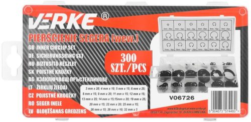 A VERKE belső seeger gyűrű készlet 300 db kiváló minőségű rugós gyűrűt tartalmaz, amelyek széles körben használhatók tengelyek, csapágyak, perselyek, tárcsák, fogaskerekek és más gépelemek axiális irányú rögzítésére.