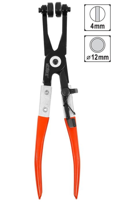 Ezek a tömlőbilincs-fogók biztosítják a táguló tömlőbilincsek gyors és precíz nyitását és meghúzását. Ideálisak gépjárművek gumivezetékein (hűtő-, üzemanyag- és légkondicionáló rendszerek) lévő tömlőbilincsekhez. Az integrált reteszelő mechanizmus stabilitást és biztonságot biztosít működés közben. Ergonomikus TPR-bevonatú fogantyú a kényelmes és biztonságos fogásért. A kontúrozott szénacél pofák optimális illeszkedést biztosítanak. A 40 HRC-s pofa keménysége fokozott kopásállóság érdekében. Az optimális 230 mm-es hosszúság könnyű hozzáférést biztosít a nehezen elérhető helyekhez.