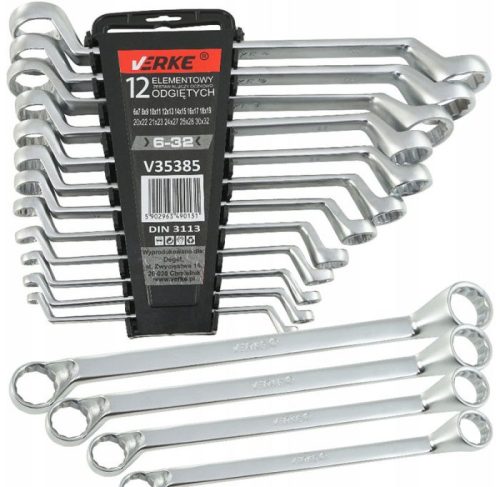 Nagyon jó minőségű, króm-vanádium acélból készült íves gyűrűs villáskulcsok. Úgy tervezték, hogy otthoni és professzionális műhelyben is működjön. Megfelelnek a DIN 3113 szabványnak.A kulcsok esztétikus szatén felülettel rendelkeznek. Az egész egy kényelmes műanyag tokba van csomagolva, így kis helyet foglal. A tok-akasztó nagyon erős és strapabíró anyagból készült, a felső részén található lyuk pedig lehetővé teszi a falra akasztását.