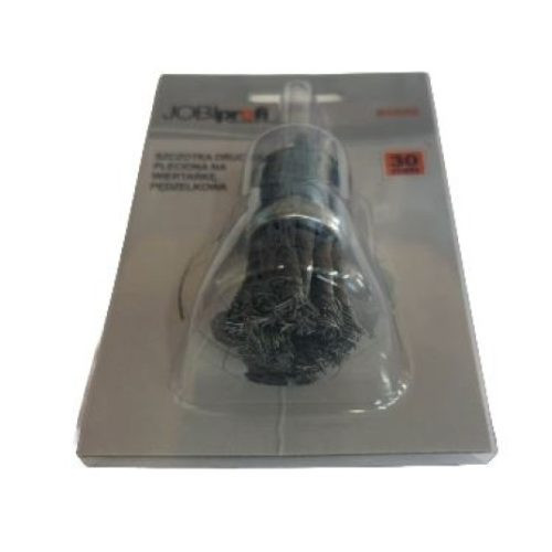 A JOBIPROFI acél sörtéjű fúrógépes kefe kompakt, 30 mm átmérőjű kialakításban, HEX (hatszögű) száras befogással.