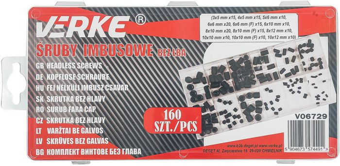 160 db-os fej nélküli imbuszcsavar készlet - rögzítő. A készlet 3x5 mm-től 10x12 mm-ig terjedő méreteket tartalmaz. Az egészet kényelmes "válogató" típusú csomagolásba helyezzük.