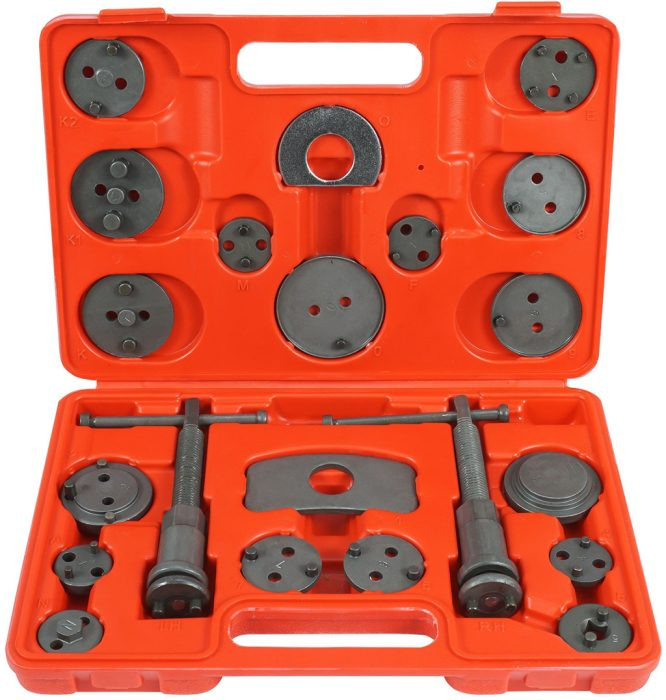 Professzionális, 21 darabos készlet a fékhengerek dugattyúinak behúzásához/nyomásához, elengedhetetlen a tárcsafékkel felszerelt járművek javításához. A gomb mágneses heggyel van ellátva, melynek köszönhetően az adott dugattyúnak megfelelő lemezt tartja a tengelyben. A készletet minden autóműhelybe tervezték, ahol segít felgyorsítani a fékrendszerek szervizelését.