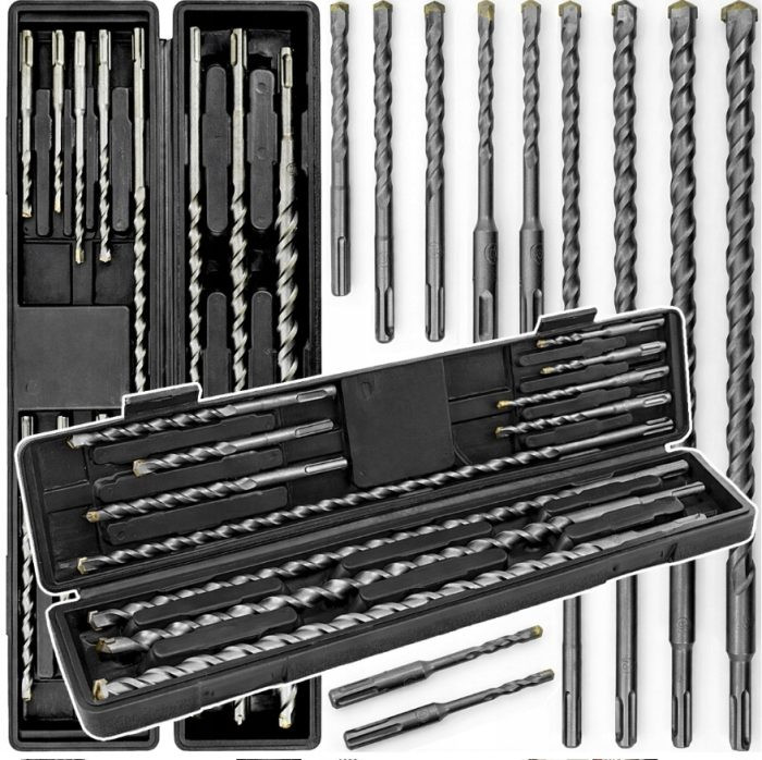 11 darabos SDS+ betonfúró készlet. A fúrófejek kiváló minőségű ötvözött acélból készültek, és keményfém (Widia) hegyekkel vannak ellátva, amelyek tartósságot, precizitást és gyors fúrást biztosítanak. A spirális hornyok ergonomikus alakja hatékony fúrt anyag eltávolítást biztosít, csökkenti a szerszám terhelését és javítja a munka kényelmét. A teljes készlet egy praktikus, masszív hordtáskában található a könnyű tárolás és szállítás érdekében.