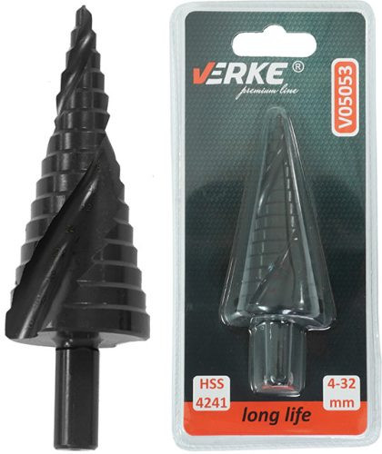 Kiváló minőségű spirális kúpos lépcsőfúró kiváló minőségű HSS4241 gyorsacélból. Széleskörű alkalmazás: fémlemezhez, műanyaghoz, fémhez. Buborékfóliába csomagolva