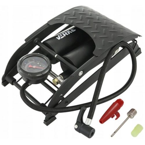 Autókerék, motorkerék, biciklikerék felfújásához alkalmas lábpumpa mérőórával együtt. Összecsukva kis helyen tárolható. Szilárd szerkezetű szivattyú, préselt, lakkozott acéllemezből, 3 mm vastagságban. Teljesen gumibevonatú pedál a jobb tapadás érdekében.