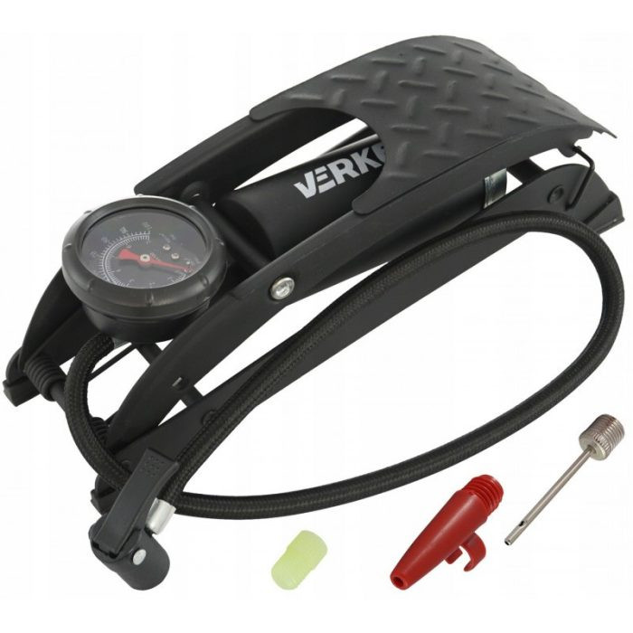 VERKE egy dugattyús lábszivattyú. Masszív felépítésű, 3 mm vastagságú dombornyomott, lakkozott acéllemezből készült szivattyú. A pedál teljes mértékben gumival borított a jobb tapadás érdekében. Könnyen leolvasható nyomásmérő, amely bar (0-7) és PSI (0-100) mutat. Tartós és rugalmas tömlő. Két adaptert tartalmaz. Tökéletes professzionális szolgáltatásokhoz és háztartásokhoz.