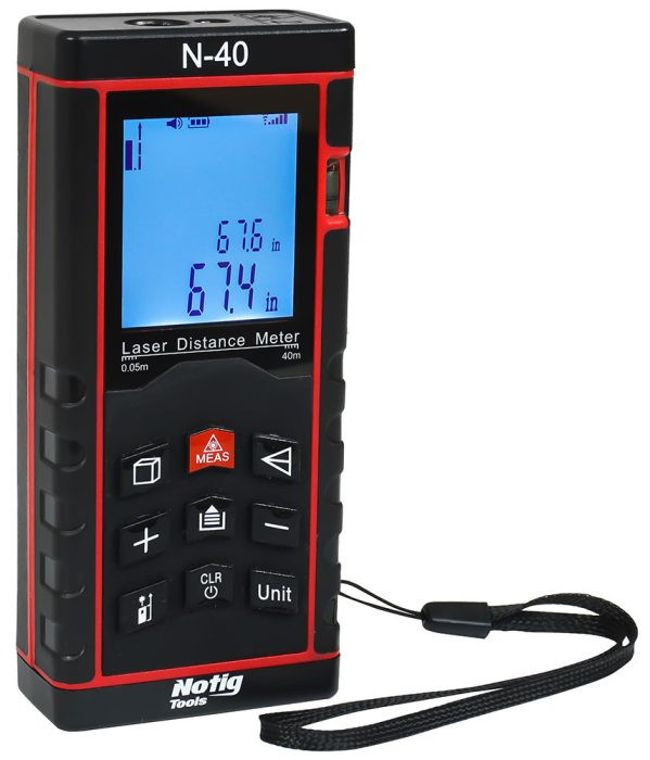 A Notig Tools modern lézeres távolságmérője olyan processzorral van felszerelve, amely gyors, pontos és fejlett méréseket tesz lehetővé. A műszerek kezelése egy praktikus panelen keresztül történik, nagy, színes kijelzővel, amely bemutatja a mérési eredményeket és az azokból származó számításokat. A beépített memóriának köszönhetően megjegyzi az utolsó 20 mérést. A háttérvilágítású kijelző megkönnyíti a mérés leolvasását. A készüléket széles üzemi hőmérséklet tartomány jellemzi -0°C és 40°C között. Ezenkívül erős tokkal felszerelt, amely övre akasztható.