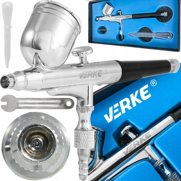 A Verke Airbrush egy miniatűr precíziós festőpisztoly. A festék permetezéssel levegő segítségével hordható fel. A festékrétegek egyenletesen fedik egymást, így kiváló eredmény érhető el használatával. Festhet szabadon, ha közvetlenül a bevonandó felületre felhordja a festéket, vagy megfelelő sablonokkal. Az Airbrush pisztoy sík felületek, valamint bonyolult alakú tárgyak festésére szolgál. Ez lehetővé teszi a pontos részletek kidolgozását is. Kis tárgyak retusálásához, állapot megőrzéséhez, modellezéséhez, kézműves dekorációjához, valamint művészeti technikához használják. Előnyei: nagyon nagy pontosság a festék felhordásában, professzionális kialakítás, kiváló minőségű rozsdamentes acélból készült fúvóka, amely biztosítja a pisztoly hosszú élettartamát.