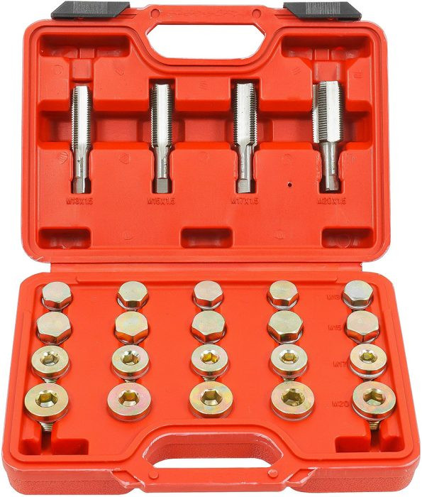 Olajteknő, sebességváltó és egyéb leeresztőcsavarok egyszerű menetjavítására szolgáló készlet. A legtöbb személygépkocsiban és kisteherautóban használt menethez illeszkedik. Autóműhelyeknek, javítóműhelyeknek és szervizeknek szánt készlet. A teljes készlet egy erős, praktikus bőröndben van a könnyű szállítás és tárolás érdekében.