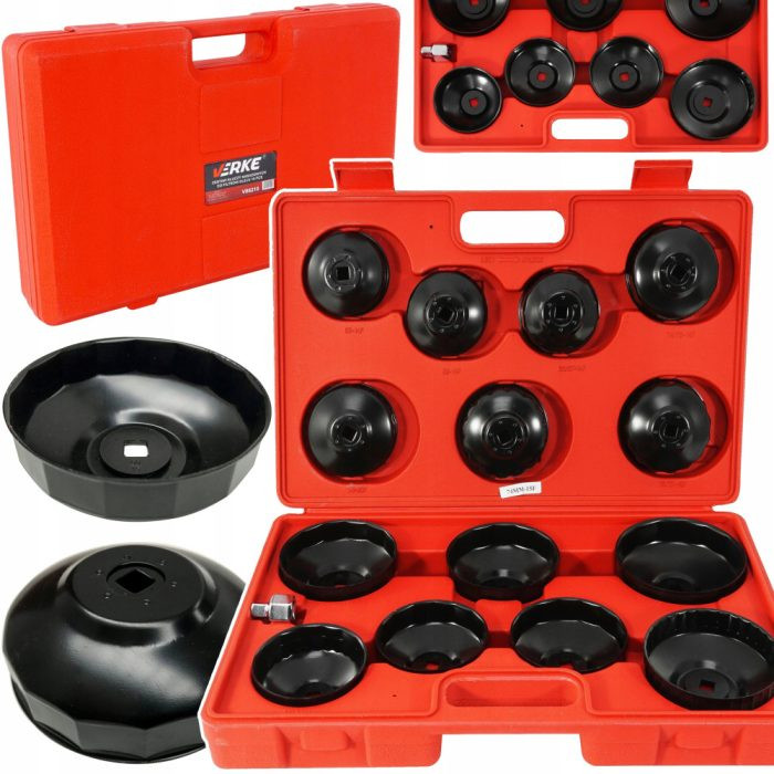 VERKE dugós kulcsok olajszűrőkhöz. A készlet a legtöbb európai, amerikai és ázsiai piacon gyártott személygépkocsiban használható. A készlet nagyon jó minőségű anyagokból készült, és tömör műanyag bőröndbe csomagolva. Alkalmazása olyan autómárkákban, mint: Mazda, Volvo, Renault, Honda, Acura, Toyota, Lexus, VW, Opel, Renault, Nissan, BMW, Audi, Mercedes, Ford, Porsche, Mitsubishi, Isuzu, Subaru, GM, Daihatsu.