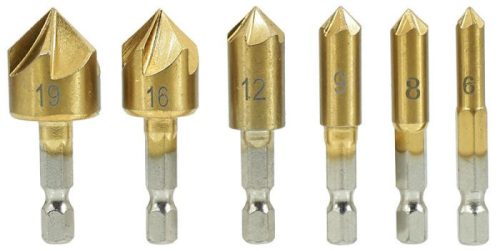 Ez a fa és rétegelt lemez süllyesztőkészlet hat darabot tartalmaz különböző méretekben: 6 mm, 8 mm, 9 mm, 12 mm, 16 mm és 19 mm.